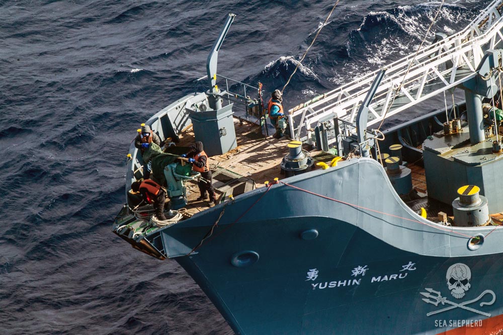 “De walvisslachters van de Nisshin Maruwerden op heterdaad betrapt, terwijl zij walvissen aan het slachten waren in het Australische walvisreservaat”, aldus kapitein Adam Meyerson van de Ocean Warrior, het nieuwste patrouilleschip van Sea Shepherd. “De Steve Irwin heeft hun illegale operaties stilgelegd en betrapte hen erop dat zij het bewijsmateriaal probeerden te verbergen.”