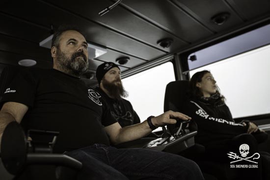 Captain Adam Meyerson en crew op de brug can de Ocean Warrior. Foto: Sea Shepherd Global / Simon Ager